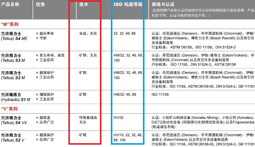 如图为某品牌液压油的产品手册,篮框里面的是粘度,要根据设备型号找准,数字表示粘度标号,前面的字母表示产品类型,如HM为抗磨。红框里面的信息可以看出大致配方,合成、矿物指的是基础油类别
