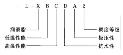 例:L-XEGHB2表示低温-40℃,高温180℃,在水洗条件下对淡水防锈,极压型,稠度等级为2。